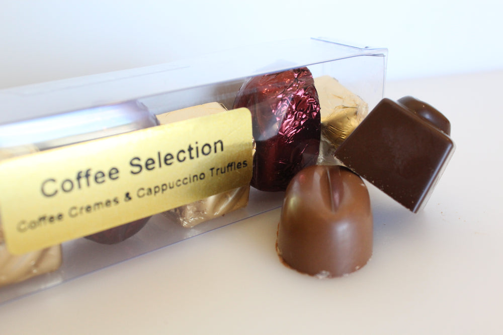 A delicious milk and dark chocolate Coffee Selection (3 milk chocolate Coffee Cremes & 2 dark chocolate Coffee Ganache) min weight 66g. Please note: The chocolate used in this product is made by a manufacturer who also processes milk chocolate, therefore milk is likely to be present.