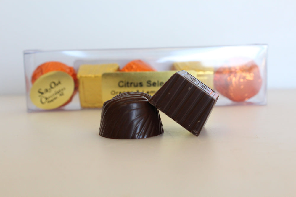 A delicious dark chocolate Citrus Selection (2 dark chocolate Orange Cremes & 3 Dark Chocolate Lemon Cremes) min weight 66g. Please note: The chocolate used in this product is made by a manufacturer who also processes milk chocolate, therefore milk is likely to be present.